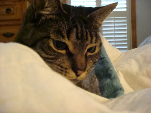 Of course anything that I attribute to what they may be thinking is pure speculation. I don't know if I am imagining it, but our mackerel tabby domestic shorthair spay, Lucyfur, appears to be contemplating deeply about something that gives her that "far away" expression on her face. Or she could just be getting ready to nod off for a cat nap. It does get so frustrating at times.