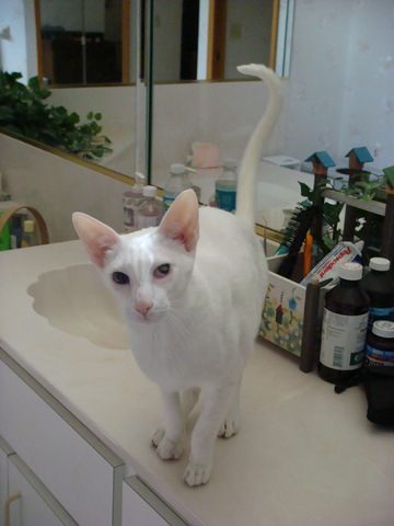 Our white Oriental Shorthair, Trouble seems to be nervous posing for this photograph. While his tail is in the upright position with a little curve on the top "telling" us that all is right with the world, his facial expression appears to be a bit contrary to his body language.