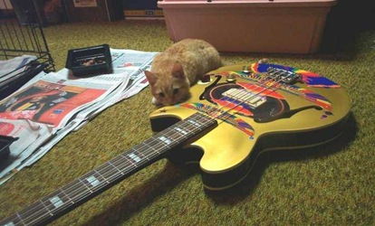 I bet that my friend Gene's kitten is considering whether to pounce on his guitar which appears to be laying in wait for capture . . .  or he is just waiting for the music to begin.